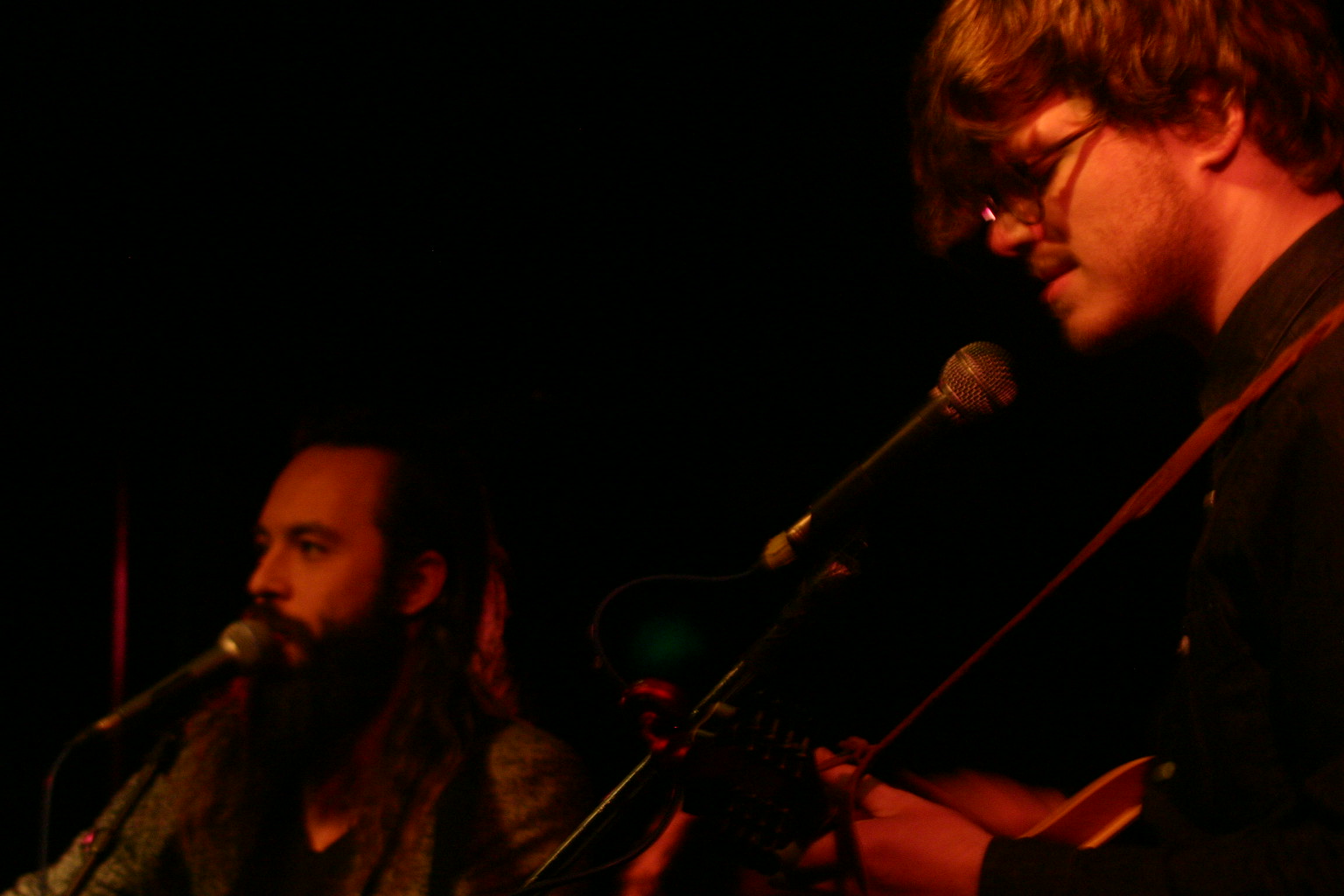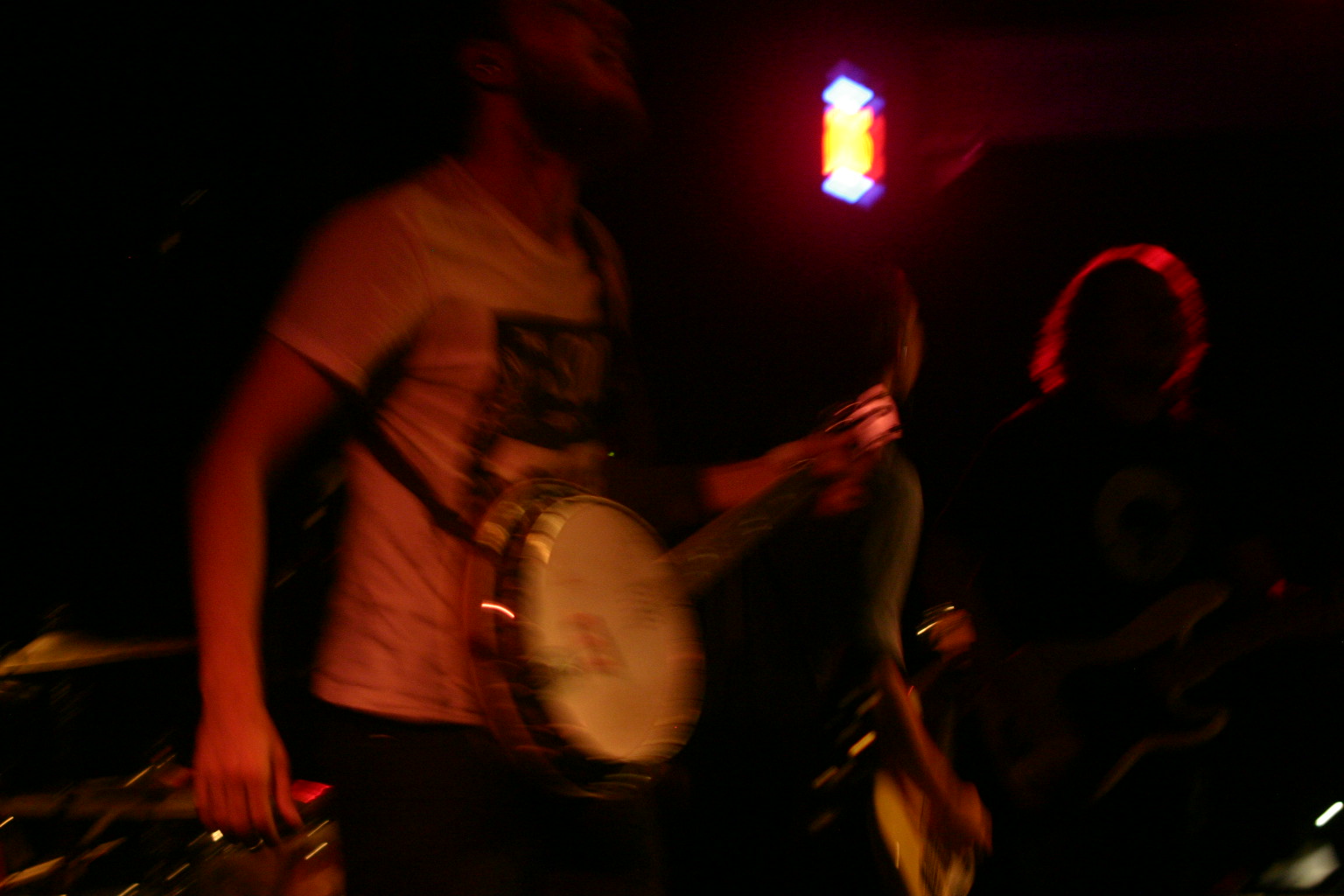 Miss Maggie’s voice has a gentle country lilt to it, the kind of lilt that seems to reminisce a bit of Ireland; gentle, confident, capable. Tyler’s voice doesn’t have that kind of lilt to it, but together, with his calm gentleness, the harmonies the Oh Hellos produce are fresh, uplifting, even when their songs grasp about in the darkness, subject-wise. Add to that two percussionists, an accordion, and a couple of crazy banjoists (who were dancing so hard we could only get blurry photos like this: